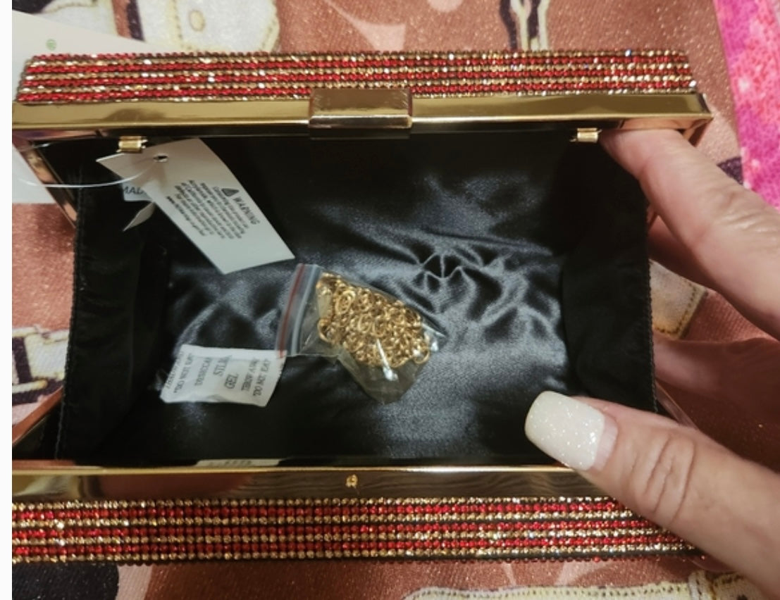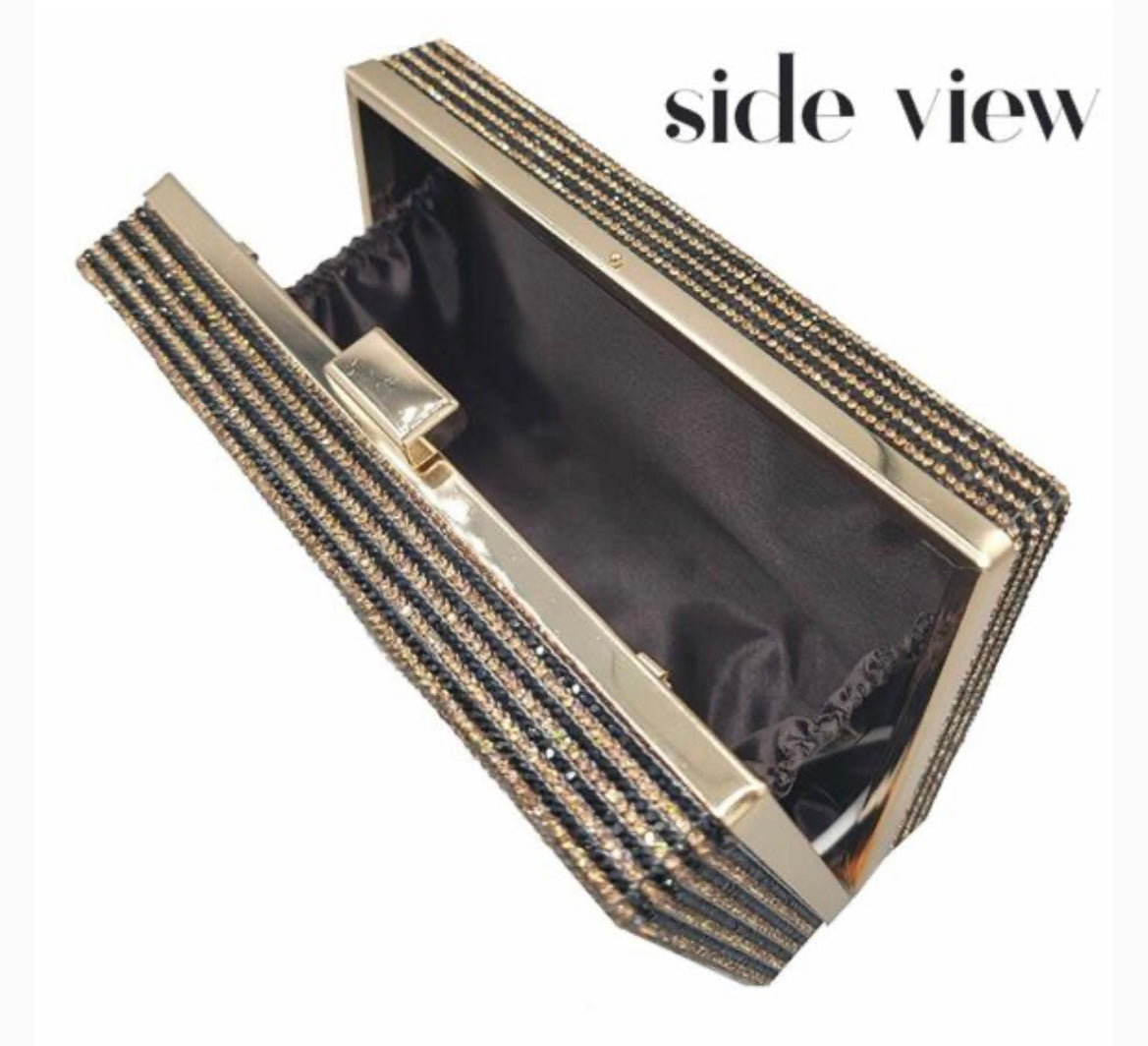 Brand New! As a small fashionable bag, it can fit a phone, lipsticks, eyeliner, pressed powder, keys and etc. The bag is made of alloy material and the body of the bag is decorated with rhinestones, which makes it very shiny and stylish. The rhinestones are encrusted by the most advanced hot drilling technology, so it is quite sturdy. 1 piece Style No : 1021M518218 • Color : Gold • Bag Size : 7" X 2" X 4.75" • No Inside Pocket • Clasp Closure Came with no chain • NO LIMIT Credit Card Rhinestone Clutch Bag